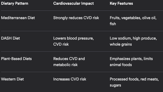 Nourishing dietary patterns—rich in fruits, vegetables, whole grains, legumes, nuts, fish, and heart healthy oils—consistently lower the risk of heart disease, stroke, and related conditions. These diets, such as the Mediterranean and DASH diets, reduce inflammatory markers, improve cholesterol profiles, lower blood pressure, and support healthful body weight management [1] [2] [3] [4] [5] [6]. In contrast, diets high in ultra-processed foods, red and processed meats, added sugars, saturated and trans fats, and excessive sodium increase cardiovascular disease risk [1] [3] [4] [5].